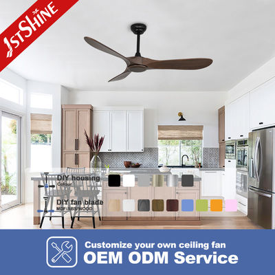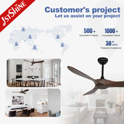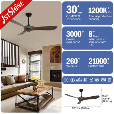 Máy quạt trần bằng gỗ bao gồm ba lưỡi dao hạt mỡ rắn để sử dụng ngoài trời, với vòng bi bôi trơn để giảm mài mòn;